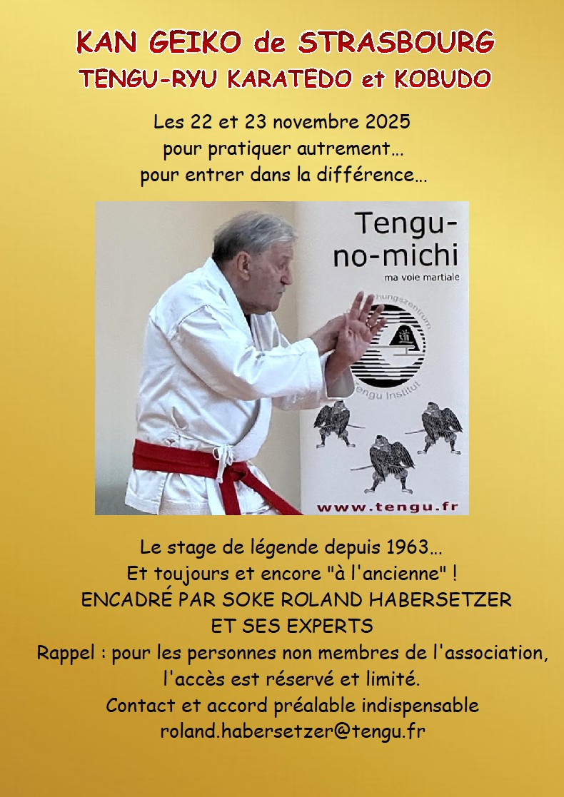 Il s'agit de réunions internationales et traditionnelles en Alsace, que Soke Roland HABERSETZER dirige lui-même à Strasbourg depuis 1962 ..., pour maintenir une Tradition vivante, allant d'un séminaire annuel consacré aux Kata anciens (Koshiki Kata) aux stages de mai et de novembre consacrés au concept "Tengu" le plus moderne à partir de techniques classiques du Shotokan et du Wado-ryu.