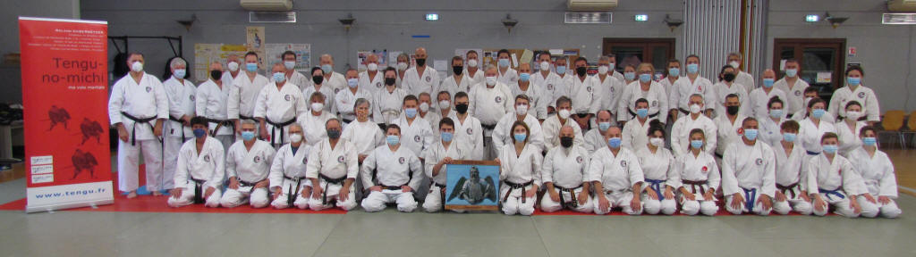 Une affluence inattendue en ces temps bousculés par la pandémie. Une photo souvenir certes un peu gâchée par les masques… Espérons qu’il n’y en aura pas d’autre par la suite, et que celle-ci restera « collector ». Avec un nouveau jeu : cherchez le Soke du Tengu-ryu… Et puis, mais si, vous y étiez aussi, non ?... Bien caché et protégé derrière le Xème masque dans la Xème rangée, depuis la gauche… ? Regardez bien… |